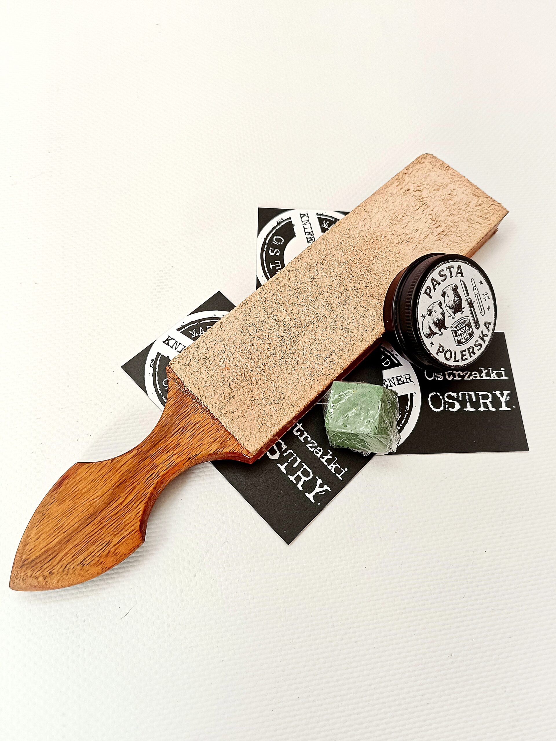 Wysokiej jakości ręcznie wykonany strop na desce do ostrzenia brzytew, noży oraz innych narzędzi wymagających precyzyjnego wykończenia. Do stropu dodana jest pasta polerską w kremie P1500 na bazie tlenku chromu, która dodatkowo poprawia efektywność ostrzenia.